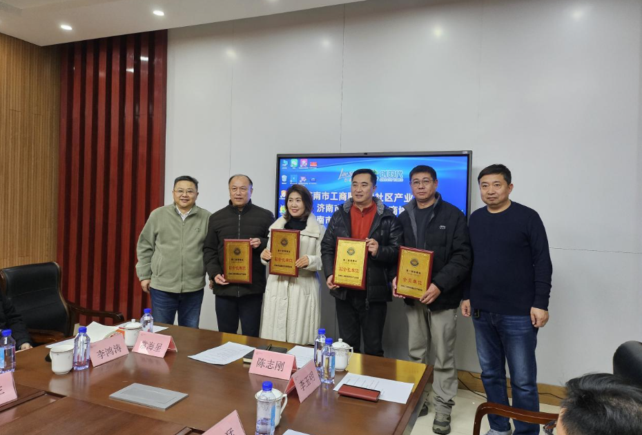 孙武虎副主席、韩刚会长为新入会单位:济南斟酒电子商贸有限公司、济南华彩众诚健康科技有限公司、山东创时代生物工程有限公司、山东秦老太食品有限公司授牌。